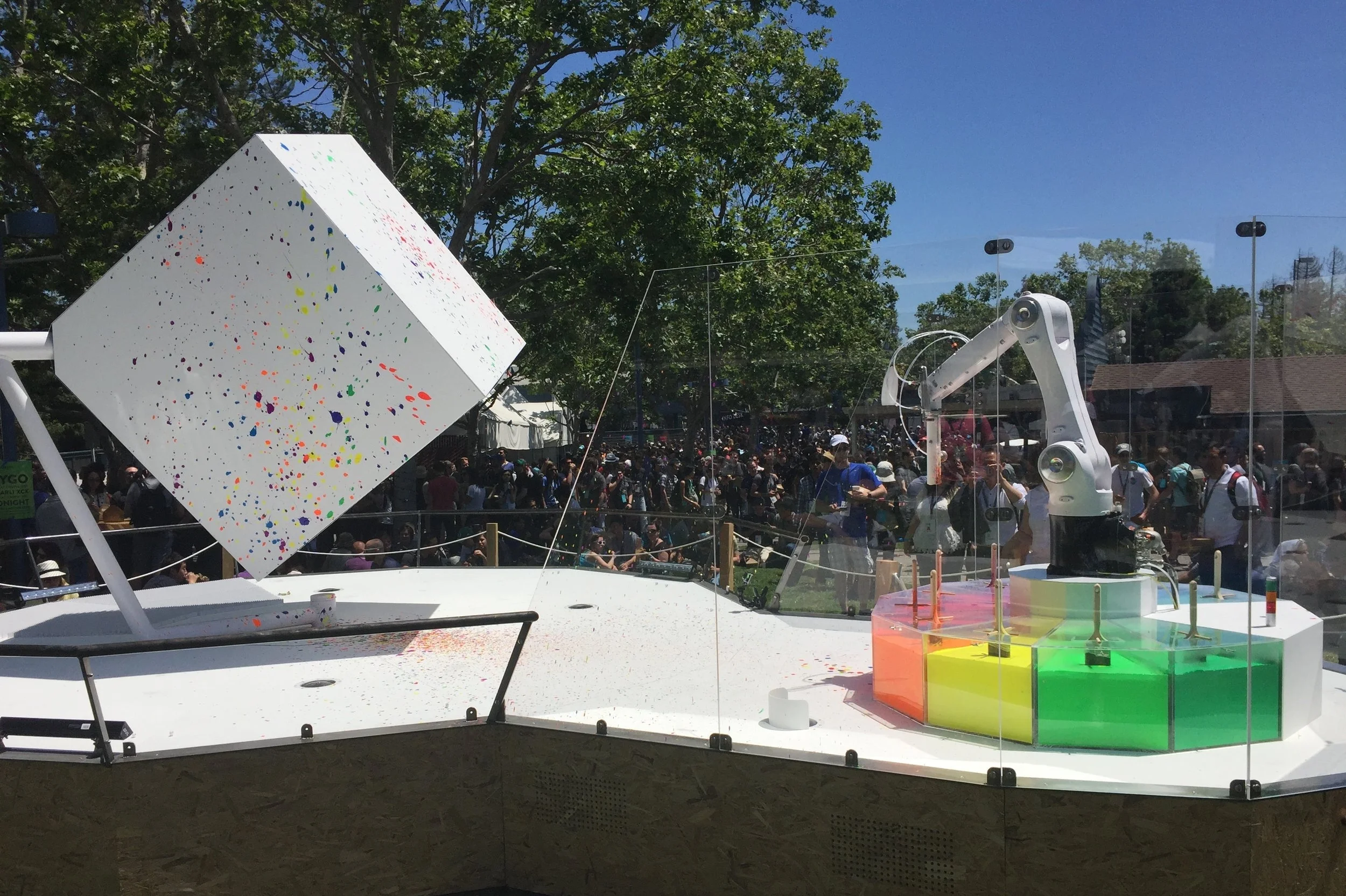 PAINT PARTY: We created an installation and an onscreen experience where people can control a robot arm and a 1000 pound cube to get their inner Pollock in action.
